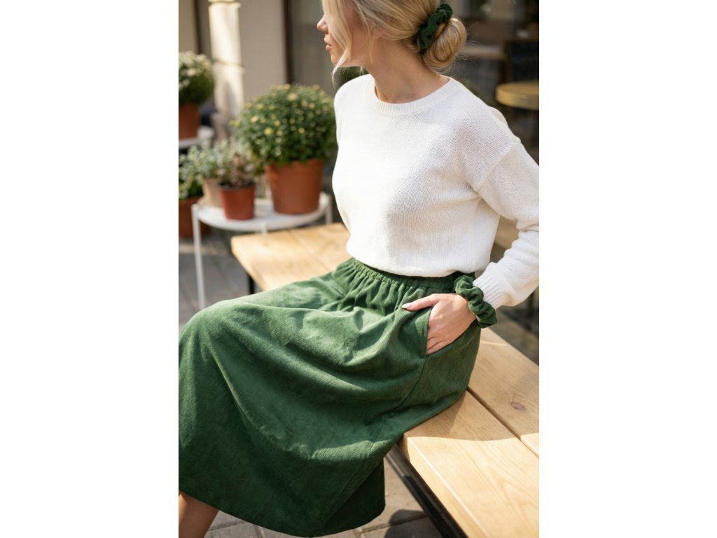 Dodajte svojmu šatníku textúru a eleganciu s touto menčestrovou sukňou v nádhernom odtieni. Tento kúsok spája nadčasový s moderným komfortom, vďaka čomu sa stane vaším obľúbeným spoločníkom počas celého roka.