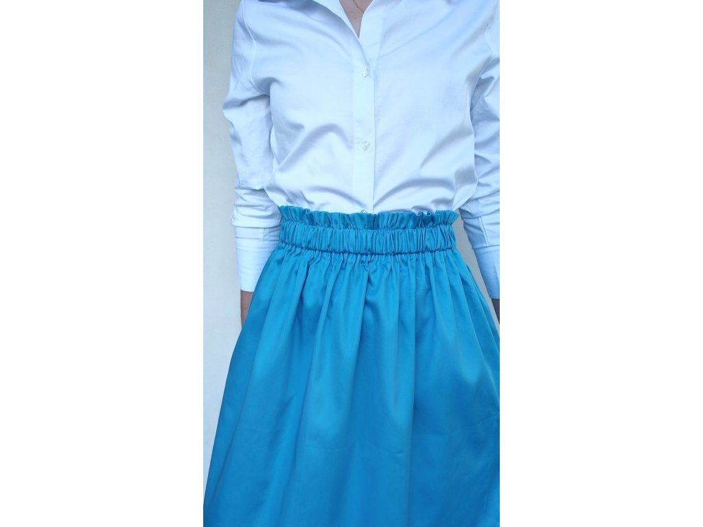 Sukňa je ušitá z ľahkého a vzdušného bavlneného saténu. Tento materiál je veľmi obľúbený u sukní pre jeho výborné vlastnosti, medzi ktoré patrí menšia krčivosť ako pri klasickej bavlne, ma jemný odlesk, vďaka čomu pôsobí elegantnejšie.