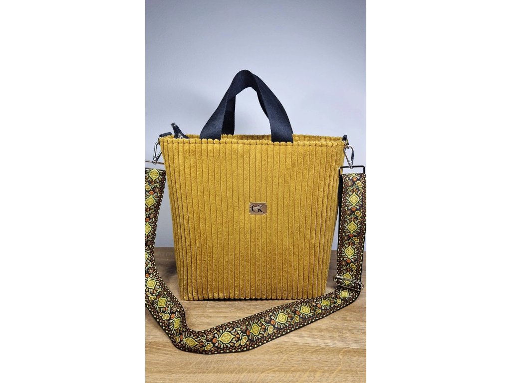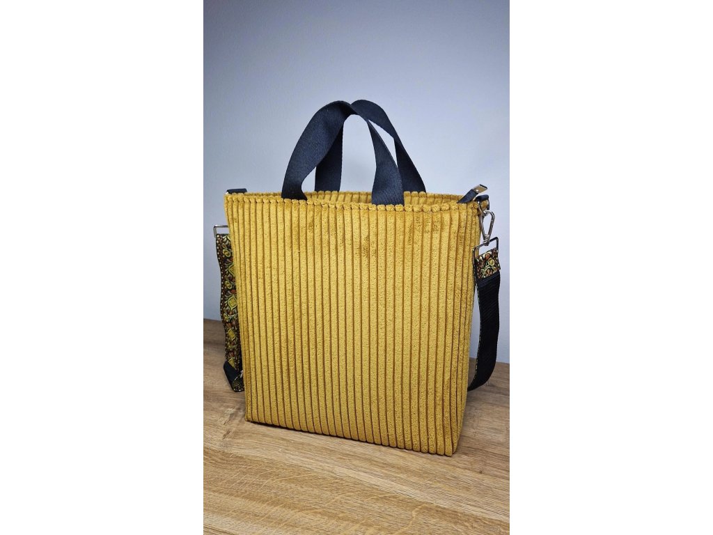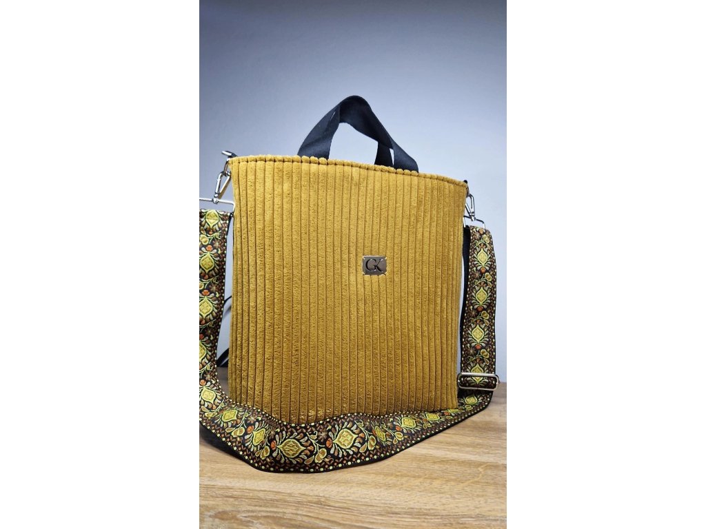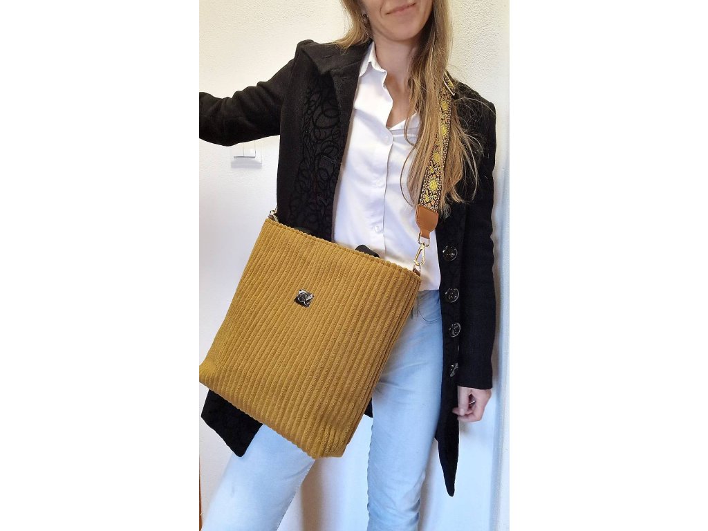 Materiál je kvalitná okrová látka v atraktívnom odtieni. Kabelku dopĺňa zaujímavy remienok v rovnakom farebnom odtieni.
